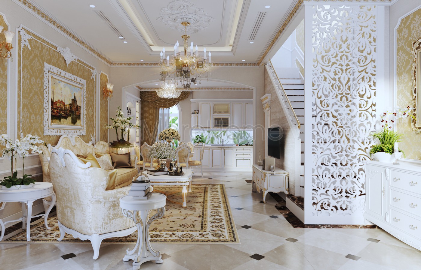 Thiết kế nội thất phòng khách tân cổ điển được kiến trúc sư đầu tư tỉ mỉ về cả đường nét và màu sắc. Các bức tường thô đơn sắc thông thường được thay thế và làm mới bằng thiết kế giấy dán tường ấn tượng. Các hoa văn chìm nhẹ nhàng gợi mở một không gian thiết kế thu hút, tránh cảm giác đơn điệu, nhàm chán từ các bức tường thô đơn giản. Bộ bàn ghế mà kiến trúc sư lựa chọn có tone màu cũng như họa tiết vừa khít, ăn nhập với thiết kế hoa văn trên giấy dán tường, giúp không gian trở nên thống nhất, góp phần định hình thiết kế và phong cách. Các nét trạm khắc nhẹ nhàng trên tay vịn hay bàn gỗ đều trở nên vô cùng cuốn hút. Ngoài ra, các chi tiết trang trí nhỏ khác như thảm trải tràn, tranh treo tường cũng góp phần lớn tăng thêm vẻ đẹp thẩm mỹ cho thiết kế.