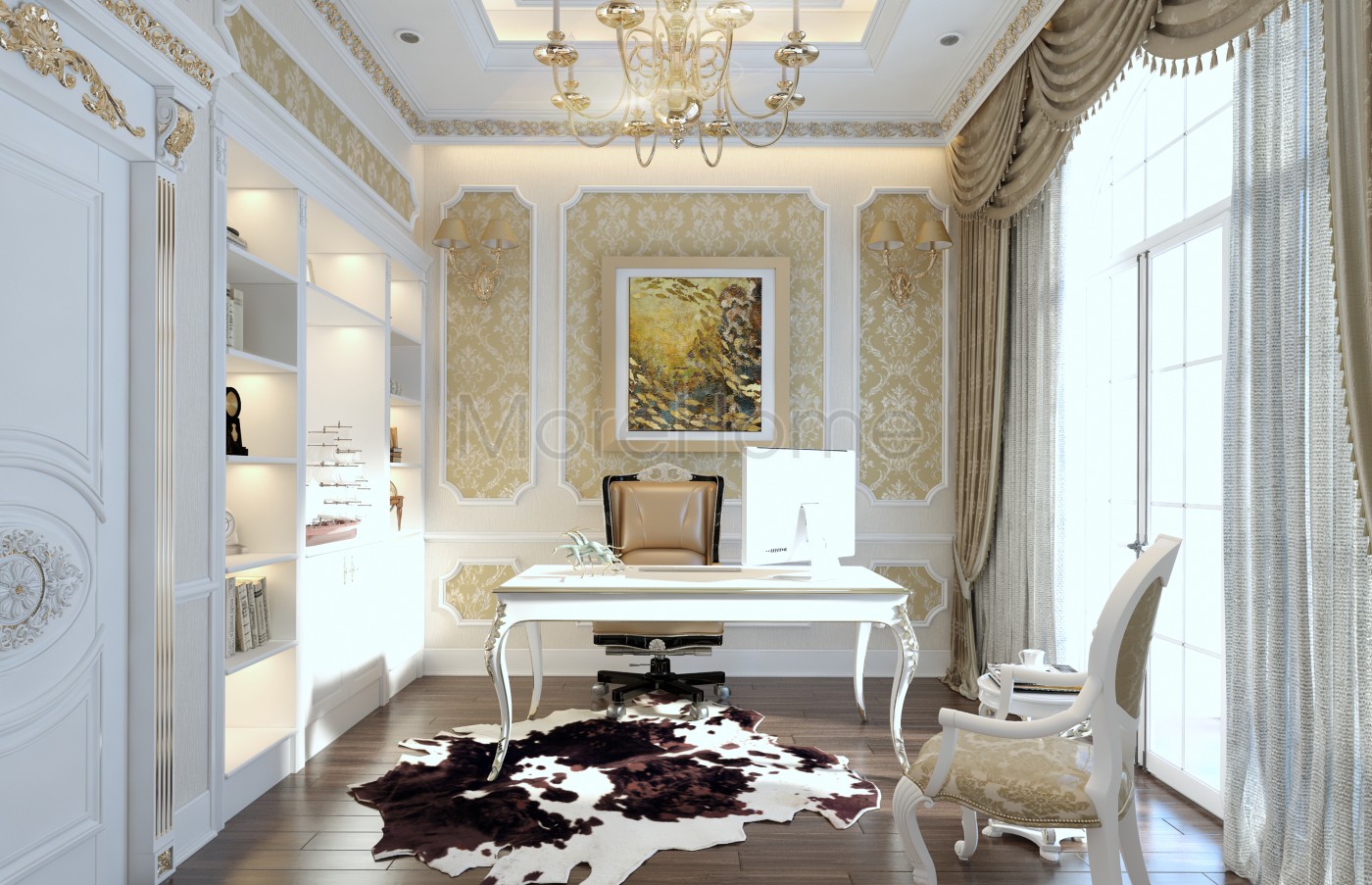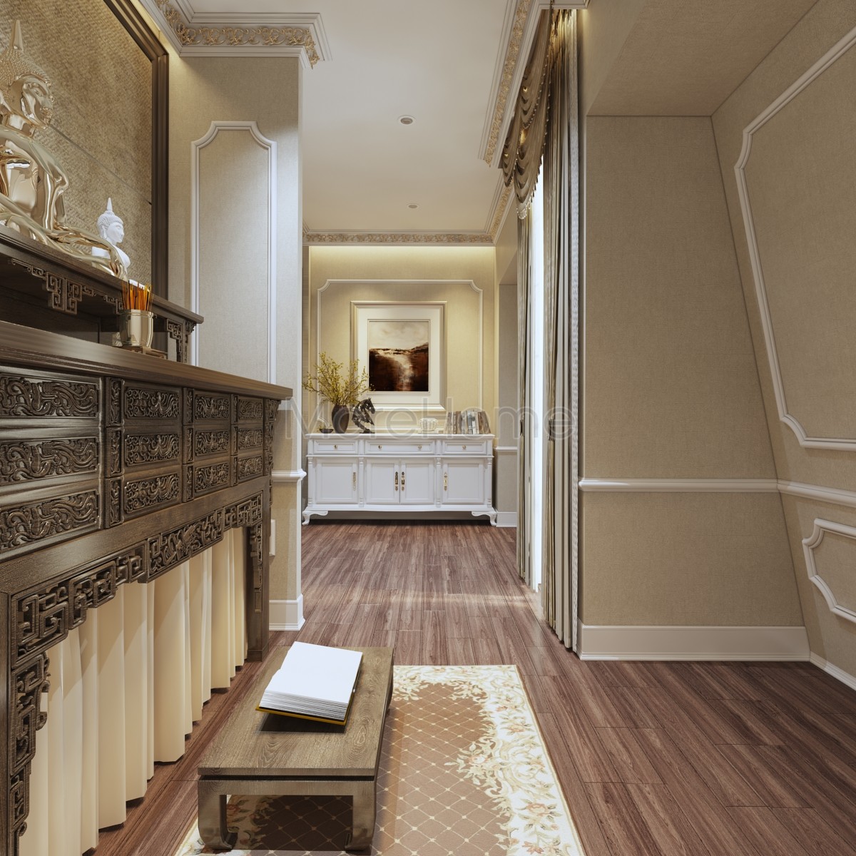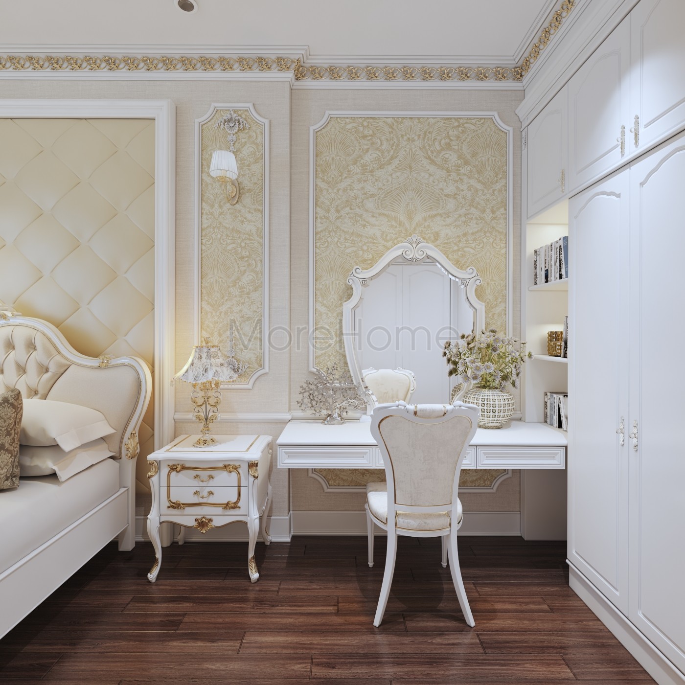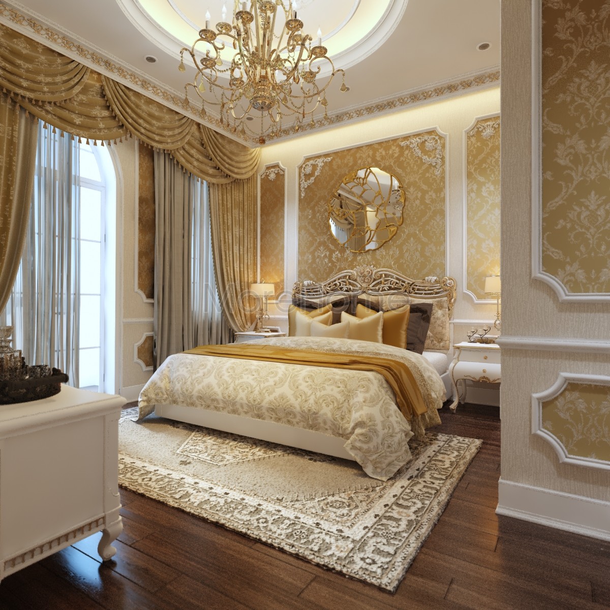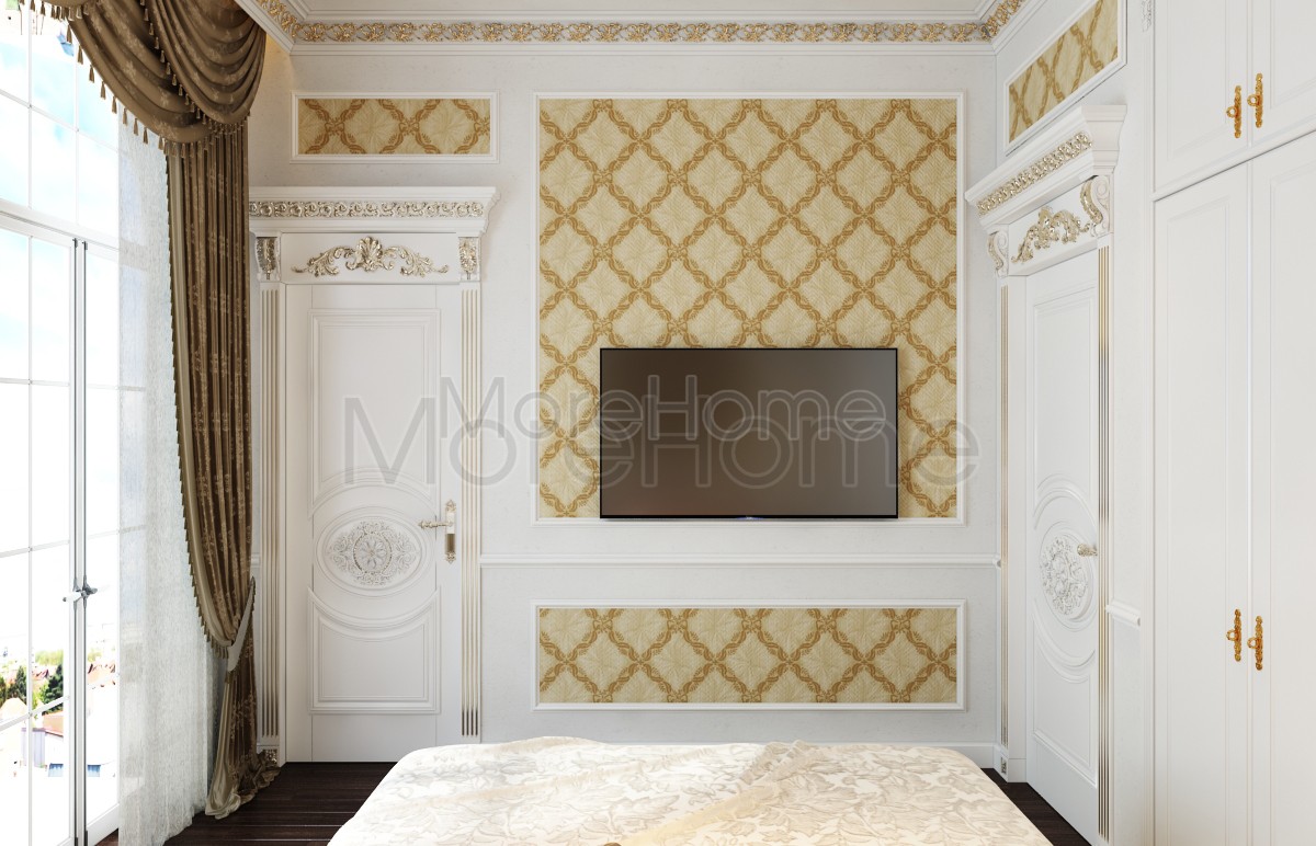 Thiết kế nội thất phòng ngủ tân cổ điển mang đến một không gian riêng tư sang trọng và thoải mái. Thiết kế không quá rộng, tủ gỗ và kệ đặt âm tường vừa tăng tính thẩm mỹ vừa tạo cảm giác cơi nới cho không gian. Các họa tiết trên tường lấy tone màu vàng ánh kim và trắng tạo sự thông suốt từ không gian sinh hoạt chung đến phòng ngủ. Ánh sáng tự nhiên được lấy từ mảng tường kính khác biệt là một điểm nhấn cho căn phòng.