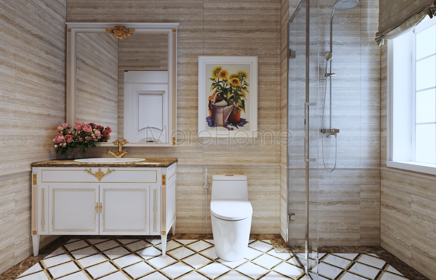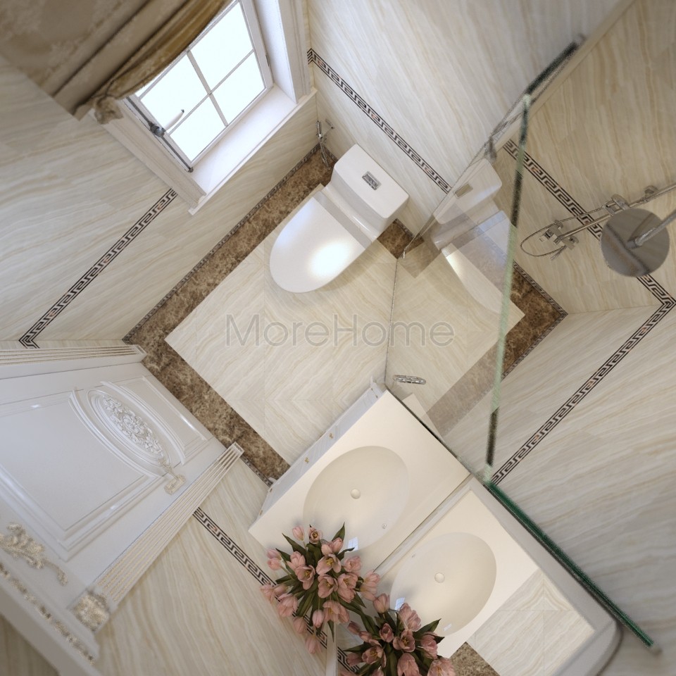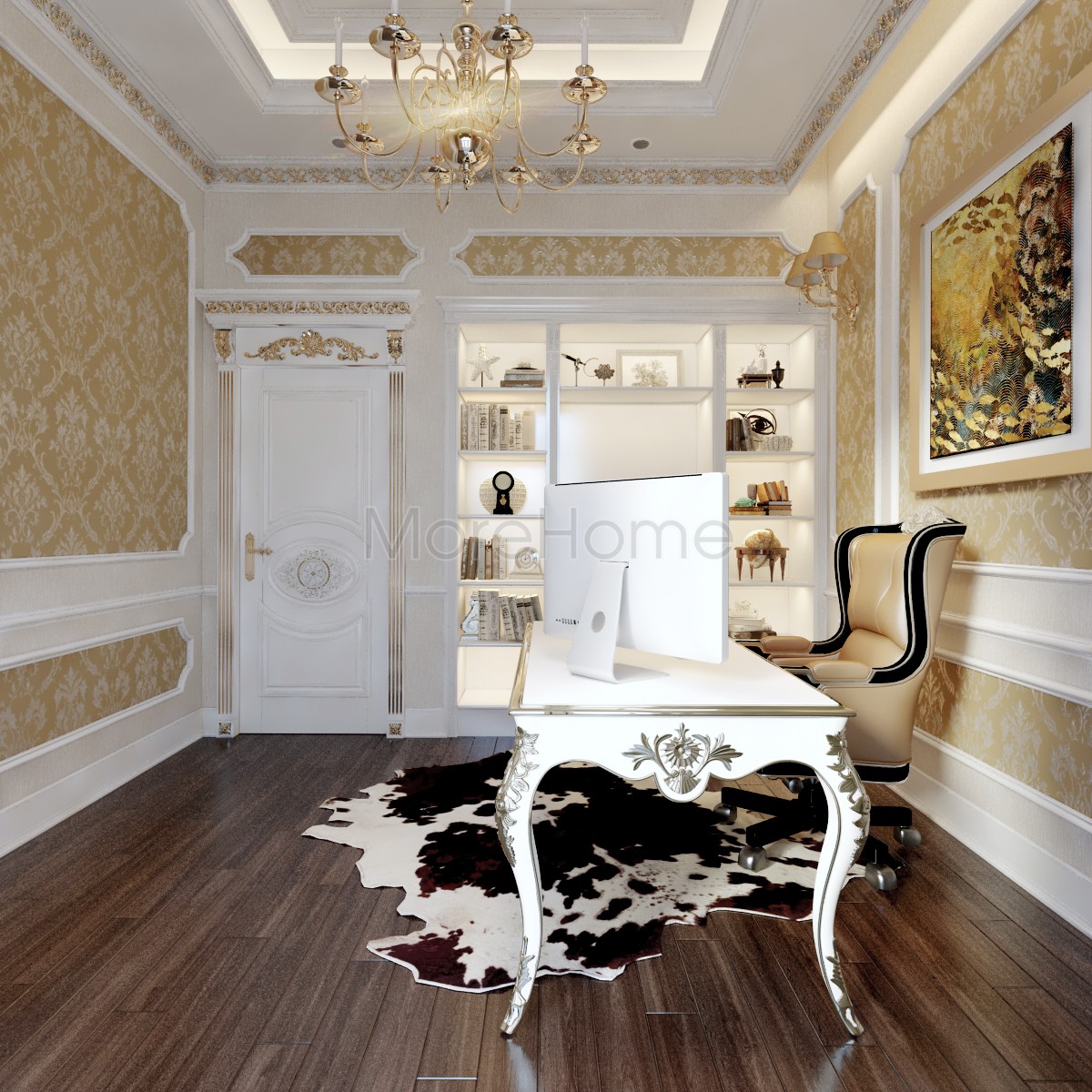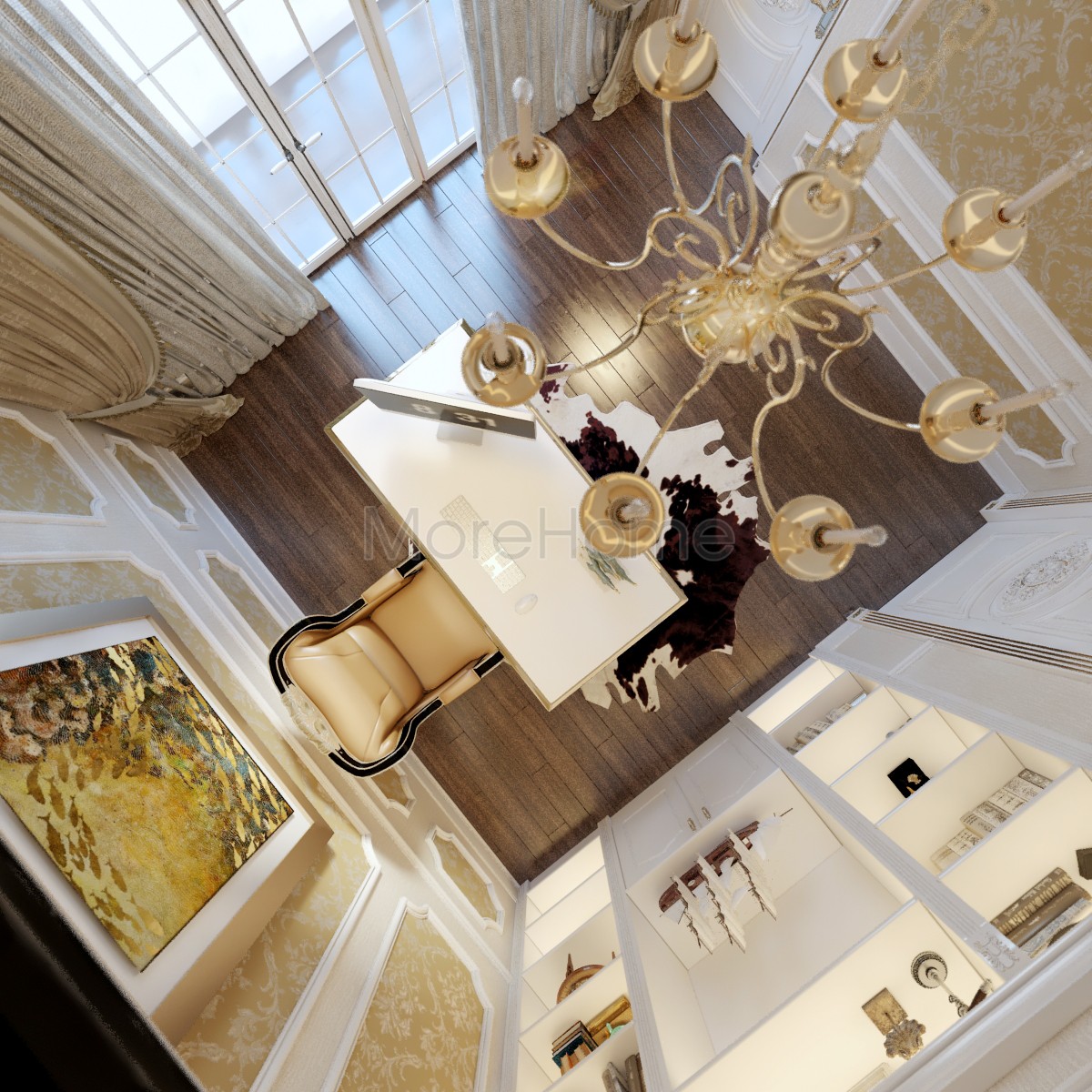 Thiết kế nội thất phòng ngủ tân cổ điển mang đến một không gian riêng tư sang trọng và thoải mái. Thiết kế không quá rộng, tủ gỗ và kệ đặt âm tường vừa tăng tính thẩm mỹ vừa tạo cảm giác cơi nới cho không gian. Các họa tiết trên tường lấy tone màu vàng ánh kim và trắng tạo sự thông suốt từ không gian sinh hoạt chung đến phòng ngủ. Ánh sáng tự nhiên được lấy từ mảng tường kính khác biệt là một điểm nhấn cho căn phòng.