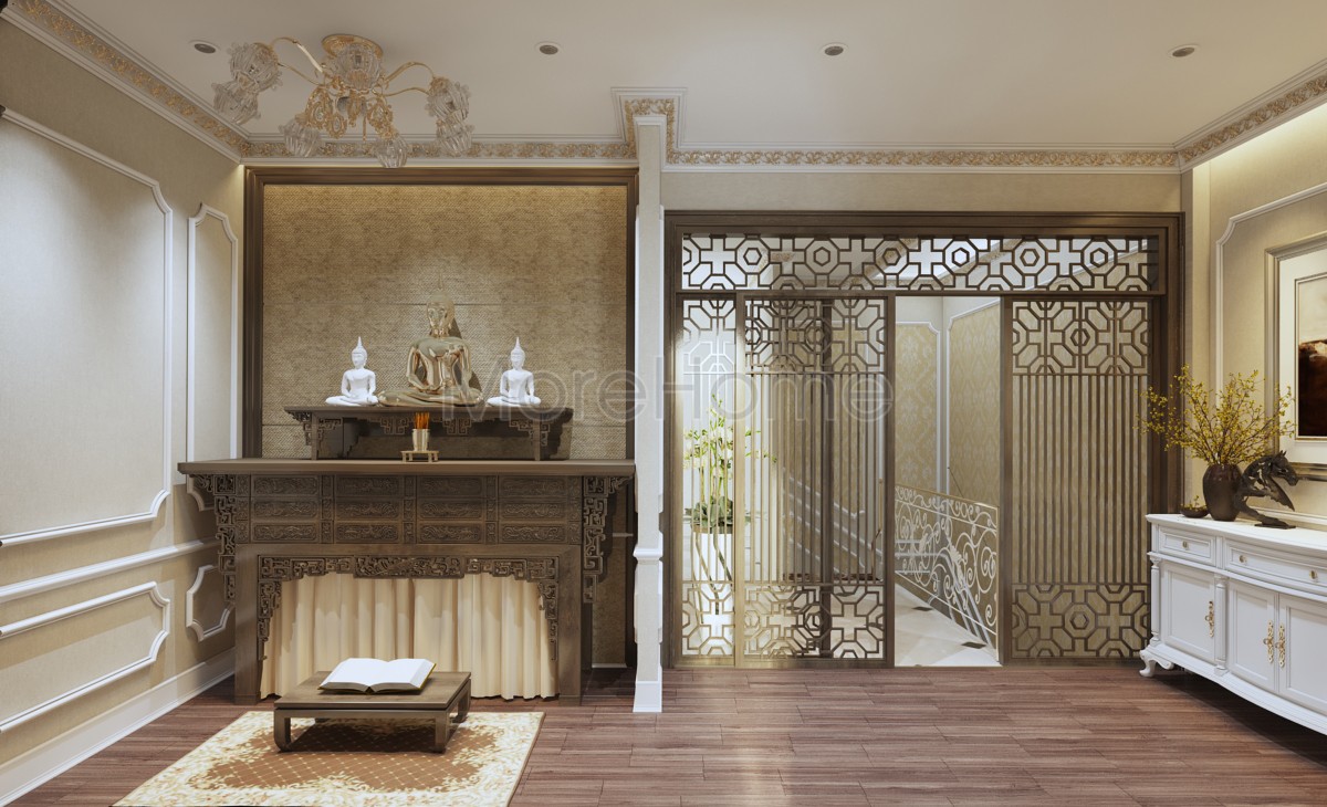 Cuối cùng là thiết kế không gian tâm linh. Một thiết kế phòng riêng biệt được dành cho không gian thờ cúng. Thay vì các cánh cửa gỗ thô thì thiết kế này sử dụng cửa hoa văn mở, kính trong suốt giúp gợi mở một không gian tâm linh ấn tượng. Thiết kế bàn thờ với tone gỗ nâu trầm ấm áp, chi tiết trang trí mà kiến trúc sư sử dụng tỉ mỉ và ấn tượng, mở ra một không gian nội thất hoàn hảo. Đối với nhiều gia đình Việt, không gian tâm linh là một phần trong tâm hồn, là nơi chúng ta tìm thấy sự bình yên, an nhiên, và cầu mong cho sự ấm êm gia đình.