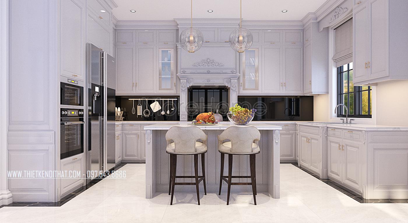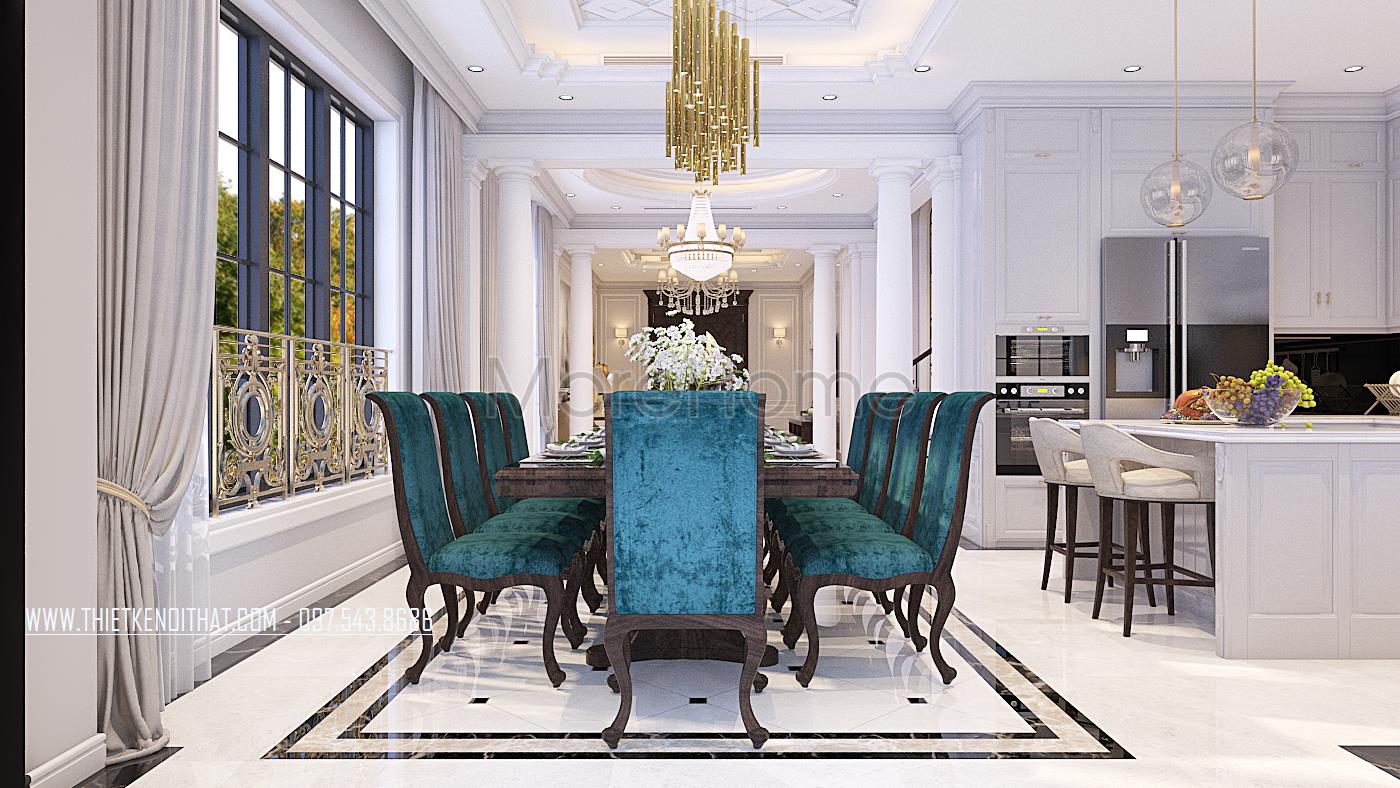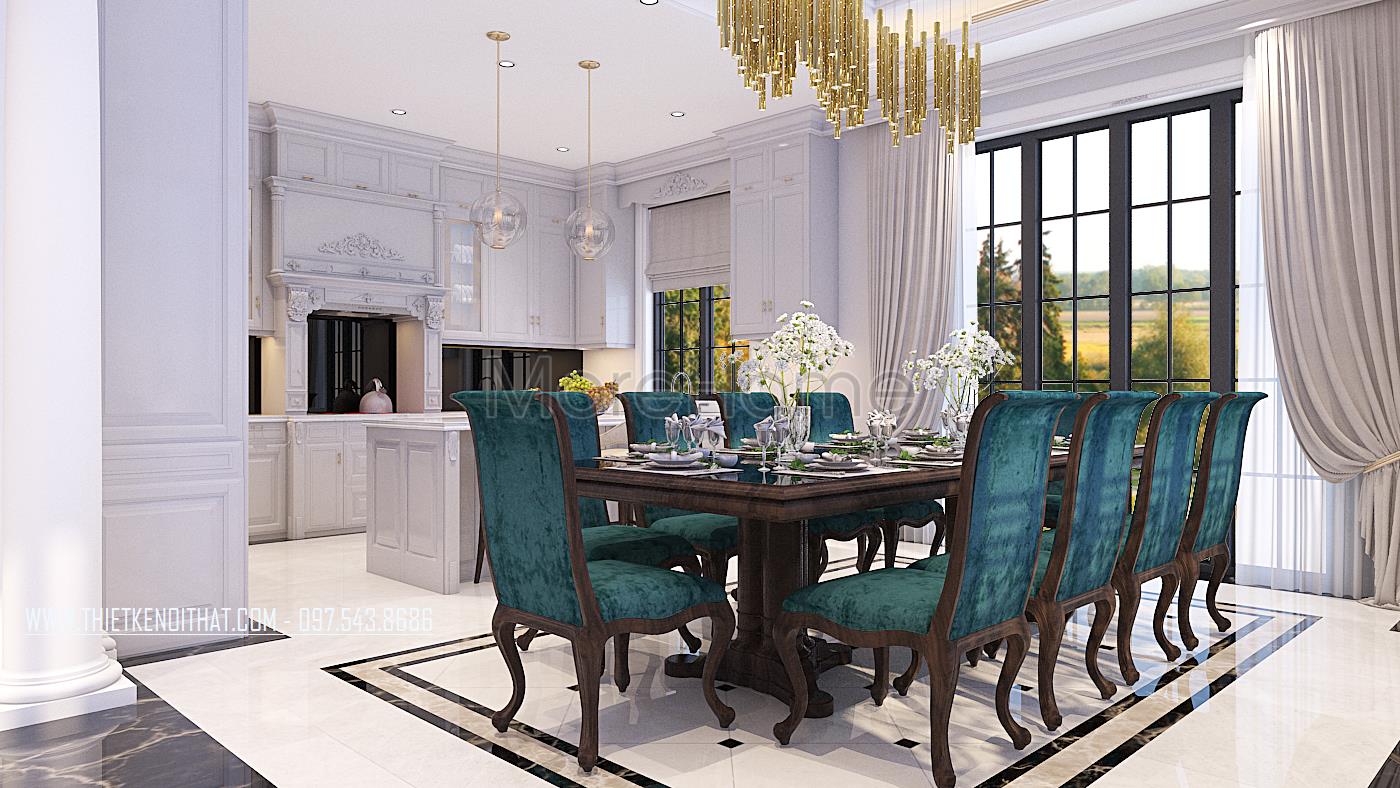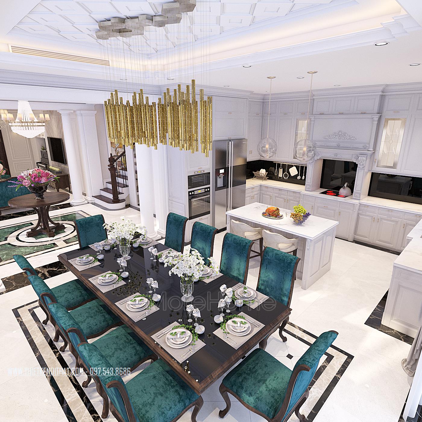 Tiếp theo là thiết kế nội thất bàn ăn và bếp liền kề. Không gian sinh hoạt chung sử dụng khá nhiều các cột tròn với chi tiết trạm khắc nhẹ nhàng là một trong những đặc điểm điển hình của phong cách thiết kế nội thất tân cổ điển. Thiết kế bàn ăn lớn và rộng, có tone màu trùng với màu sắc mà kiến trúc sư đã lựa chọn cho thiết kế sofa phòng khách giúp mang đến cảm giác thống nhất cho thiết kế. Bàn ăn lớn với các chi tiết trang trí cong mềm mại theo đúng phong cách tân cổ điển. Các chi tiết khác như đèn chiếu sáng, lọ hoa,… giúp không gian trở nên thu hút hơn.