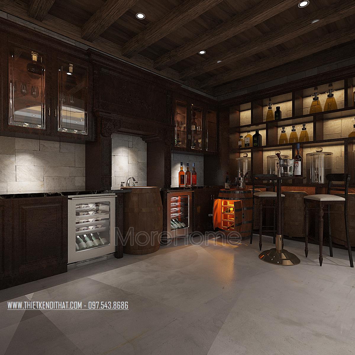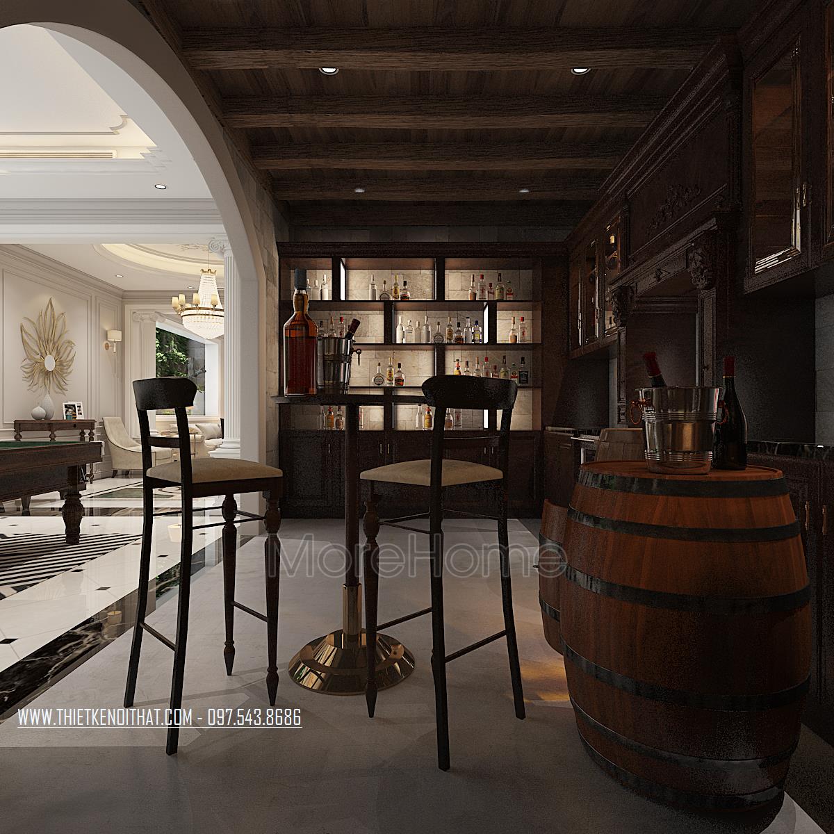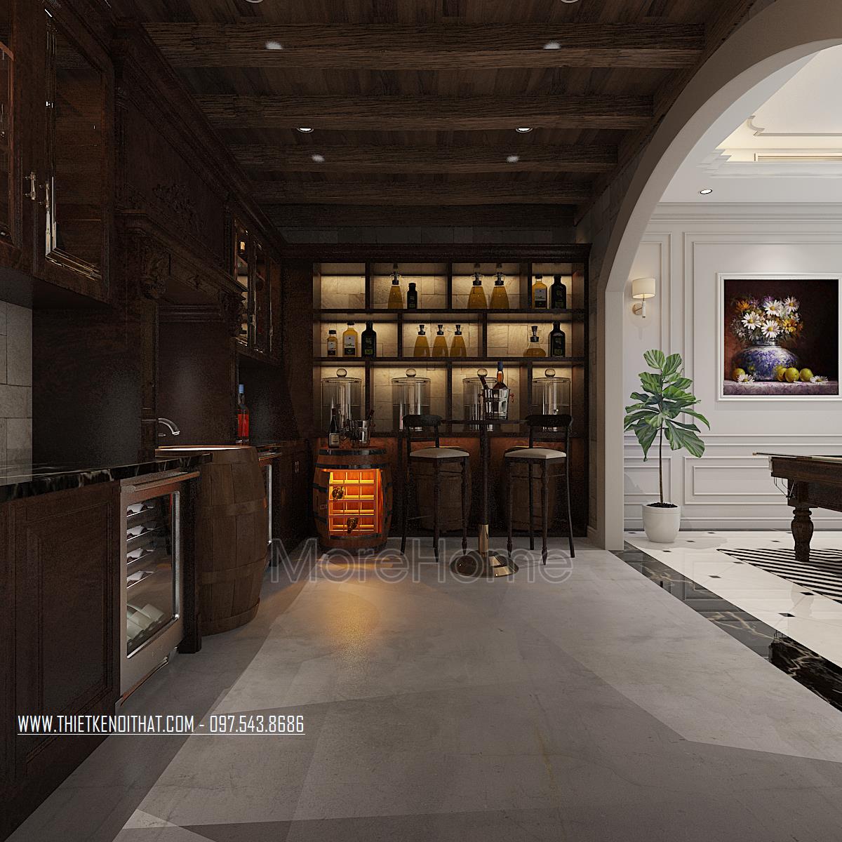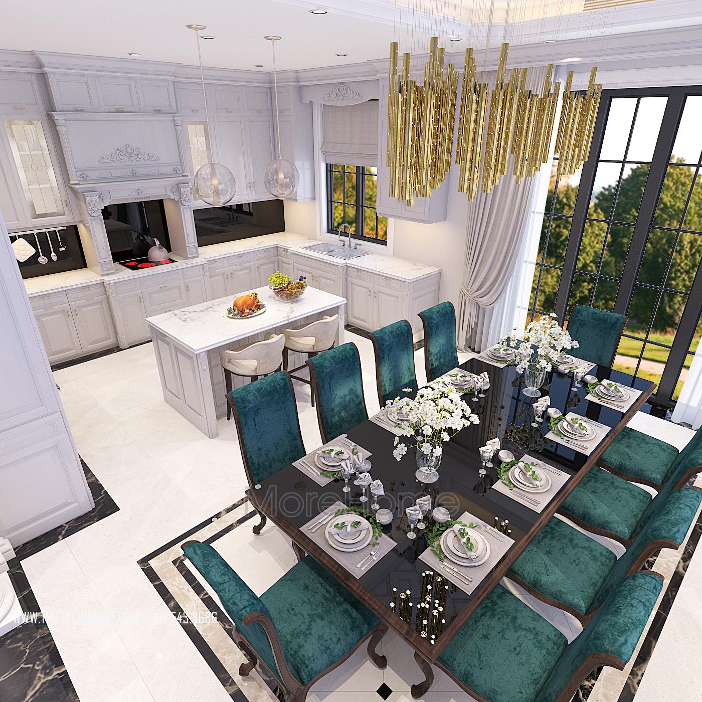 Tiếp theo là thiết kế nội thất bàn ăn và bếp liền kề. Không gian sinh hoạt chung sử dụng khá nhiều các cột tròn với chi tiết trạm khắc nhẹ nhàng là một trong những đặc điểm điển hình của phong cách thiết kế nội thất tân cổ điển. Thiết kế bàn ăn lớn và rộng, có tone màu trùng với màu sắc mà kiến trúc sư đã lựa chọn cho thiết kế sofa phòng khách giúp mang đến cảm giác thống nhất cho thiết kế. Bàn ăn lớn với các chi tiết trang trí cong mềm mại theo đúng phong cách tân cổ điển. Các chi tiết khác như đèn chiếu sáng, lọ hoa,… giúp không gian trở nên thu hút hơn.
