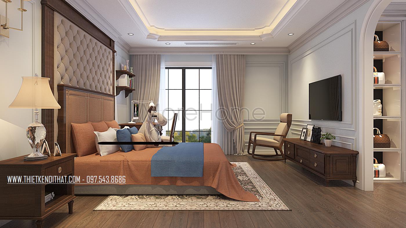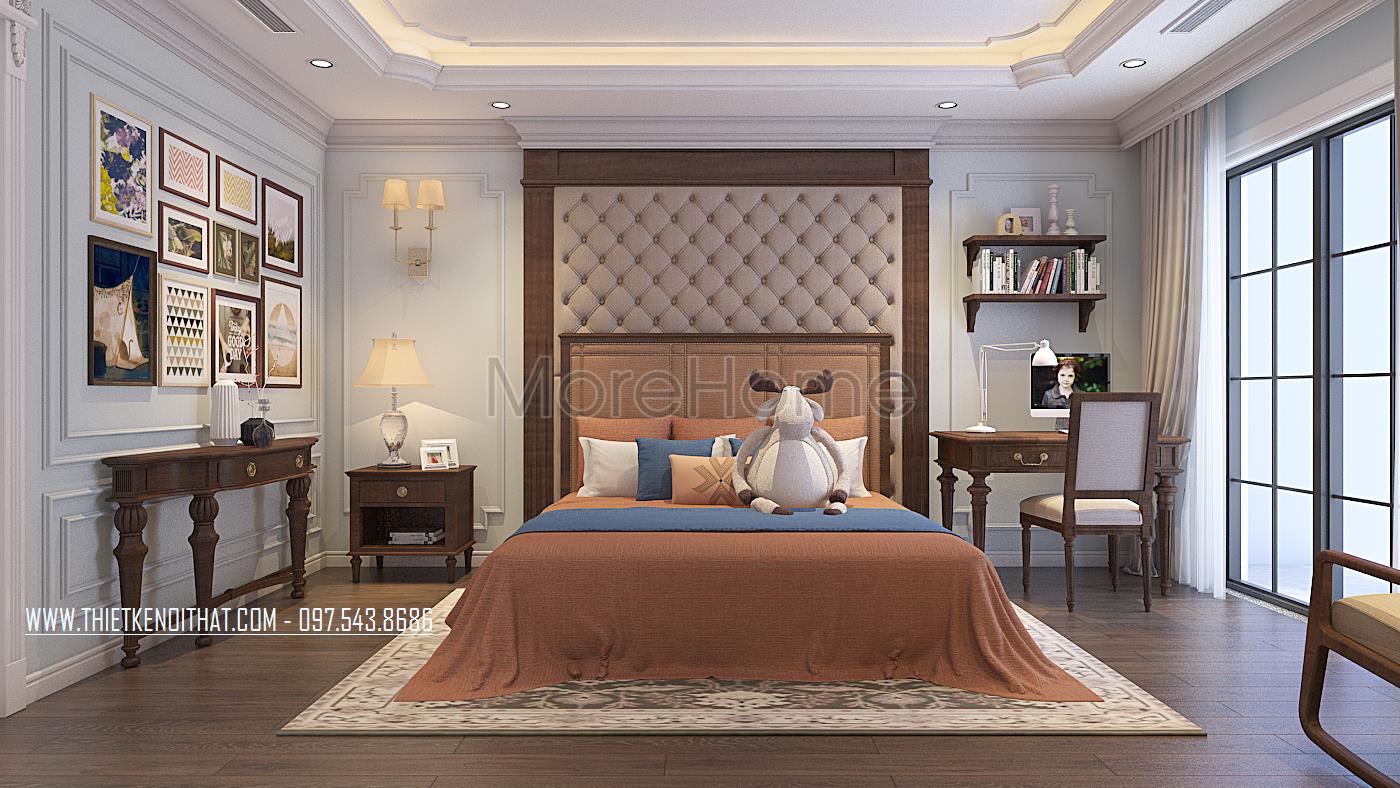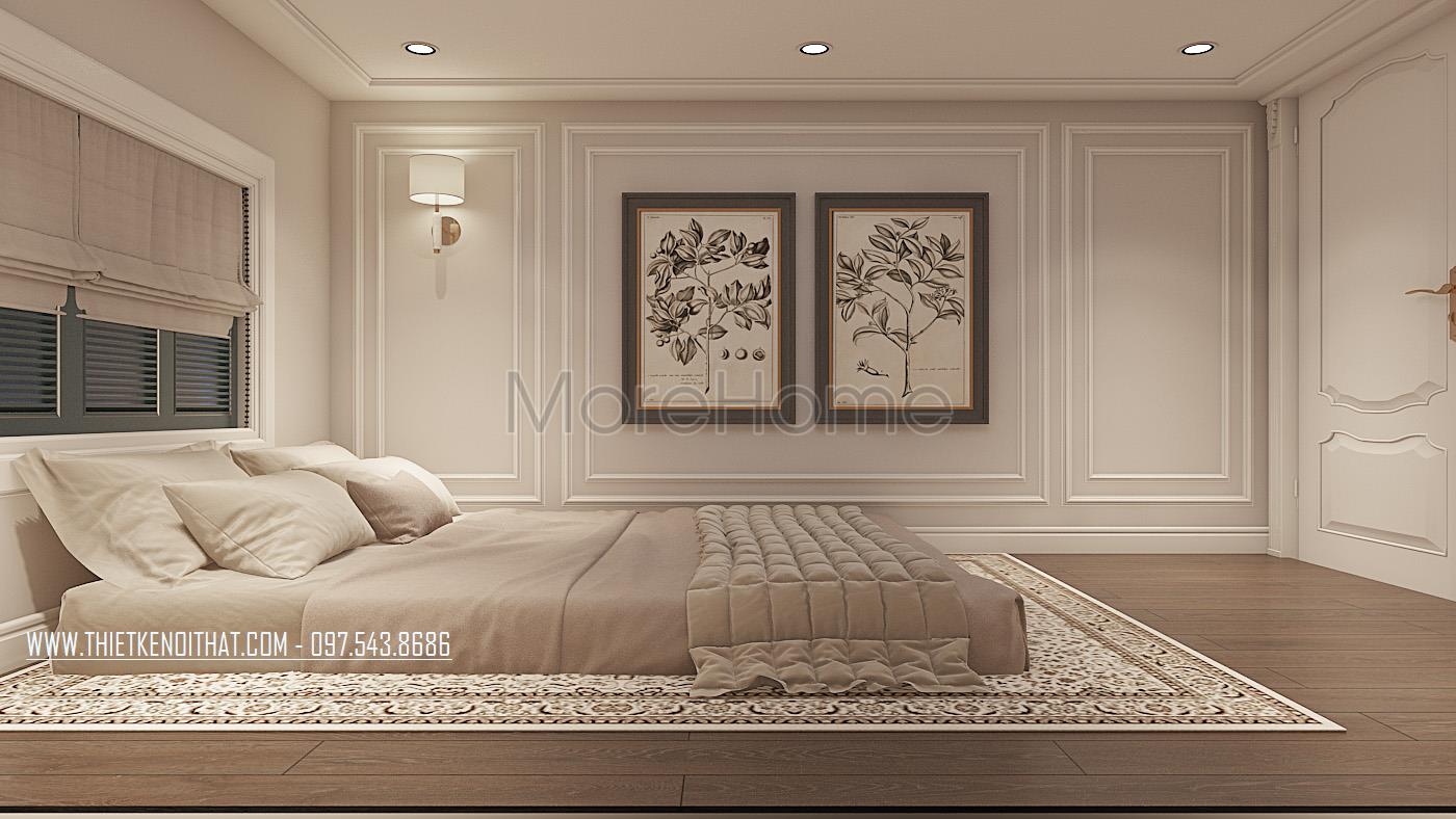 Thiết kế nội thất phòng ngủ phong cách tân cổ điển sử dụng các vật liệu nhẹ như gỗ, kính cường lực làm chủ yếu gợi mở một không gian thiết kế tinh tế, nhẹ nhàng. Ánh sáng tự nhiên được tận dụng từ khung cửa rộng gợi mở một không gian sống tràn đầy sức sống, sự thoải mái và dễ chịu. Thiết kế trang trí giường kệ sử dụng các thanh ngang, dọc làm chủ yếu tuy nhiên vẫn kết hợp các chi tiết trạm khắc ấn tượng, vừa đảm bảo giữ nguyên nét đẹp tân cổ điển lại không làm ảnh hưởng đến diện tích hay mang đến cảm giác nhàm chán cho không gian.