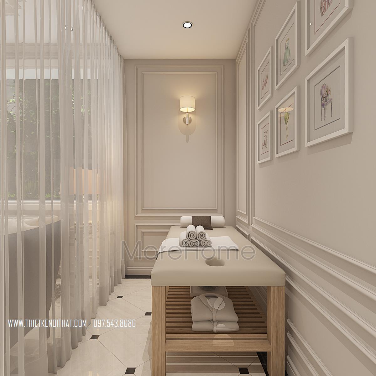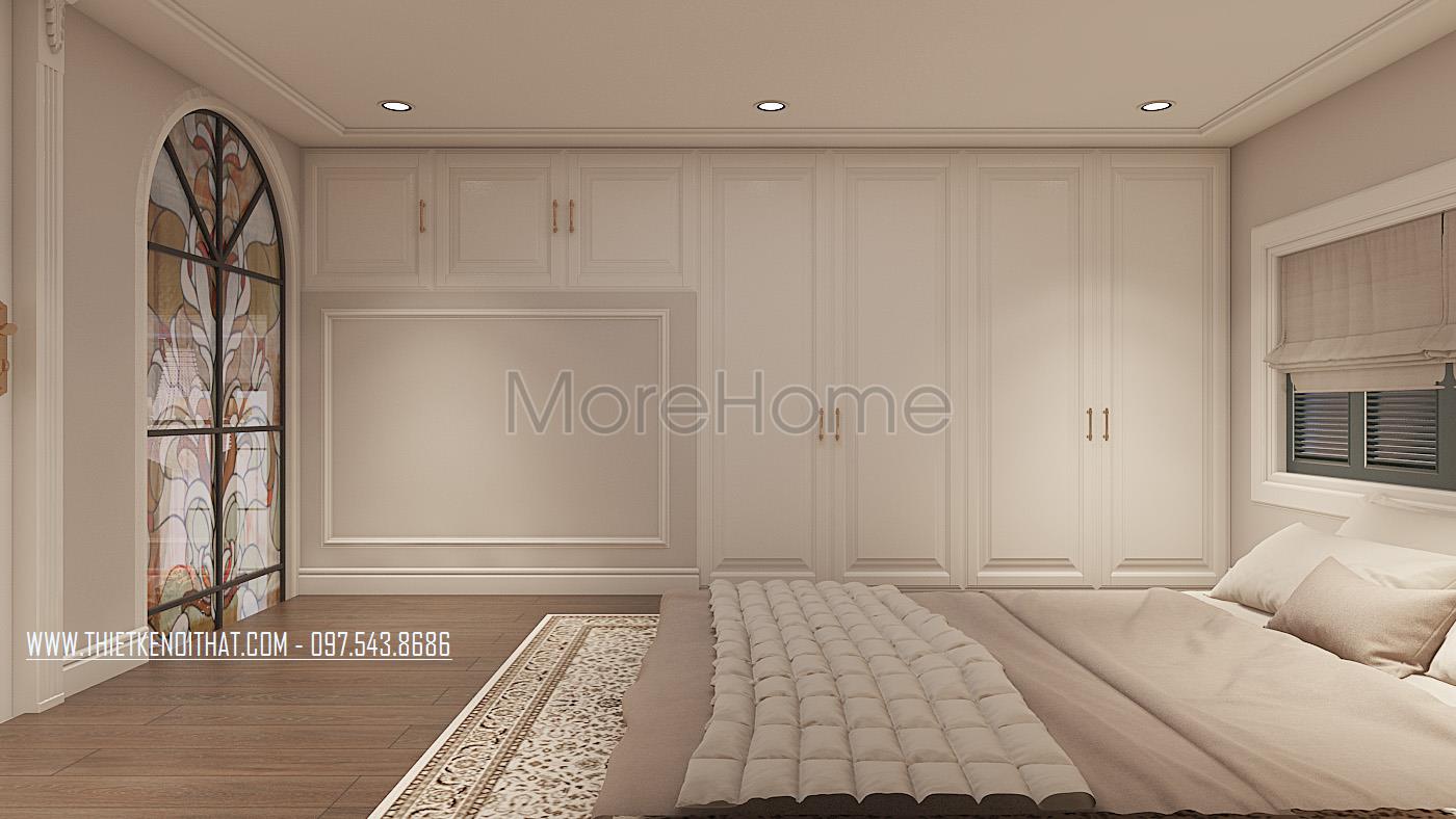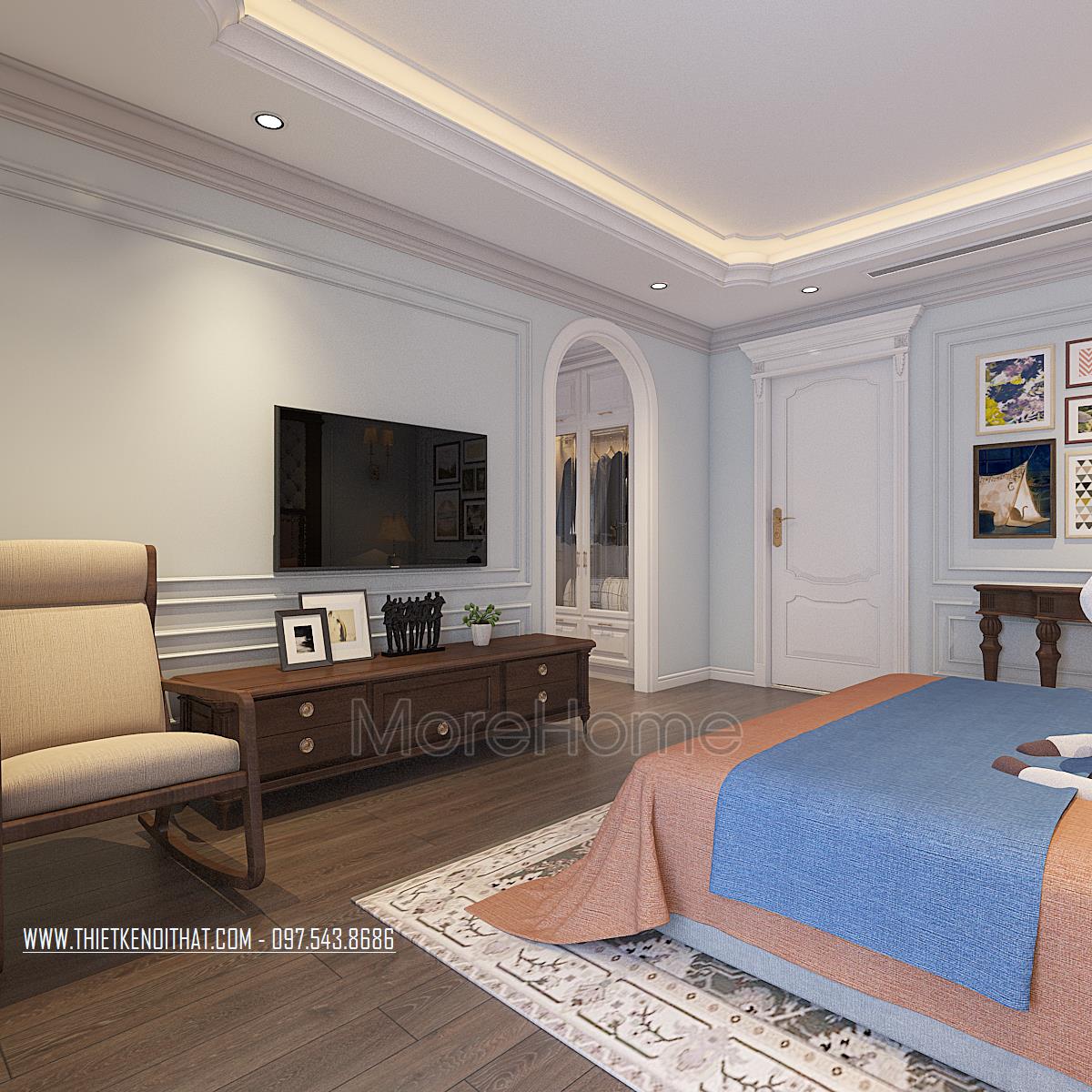 Thiết kế nội thất phòng ngủ phong cách tân cổ điển sử dụng các vật liệu nhẹ như gỗ, kính cường lực làm chủ yếu gợi mở một không gian thiết kế tinh tế, nhẹ nhàng. Ánh sáng tự nhiên được tận dụng từ khung cửa rộng gợi mở một không gian sống tràn đầy sức sống, sự thoải mái và dễ chịu. Thiết kế trang trí giường kệ sử dụng các thanh ngang, dọc làm chủ yếu tuy nhiên vẫn kết hợp các chi tiết trạm khắc ấn tượng, vừa đảm bảo giữ nguyên nét đẹp tân cổ điển lại không làm ảnh hưởng đến diện tích hay mang đến cảm giác nhàm chán cho không gian.