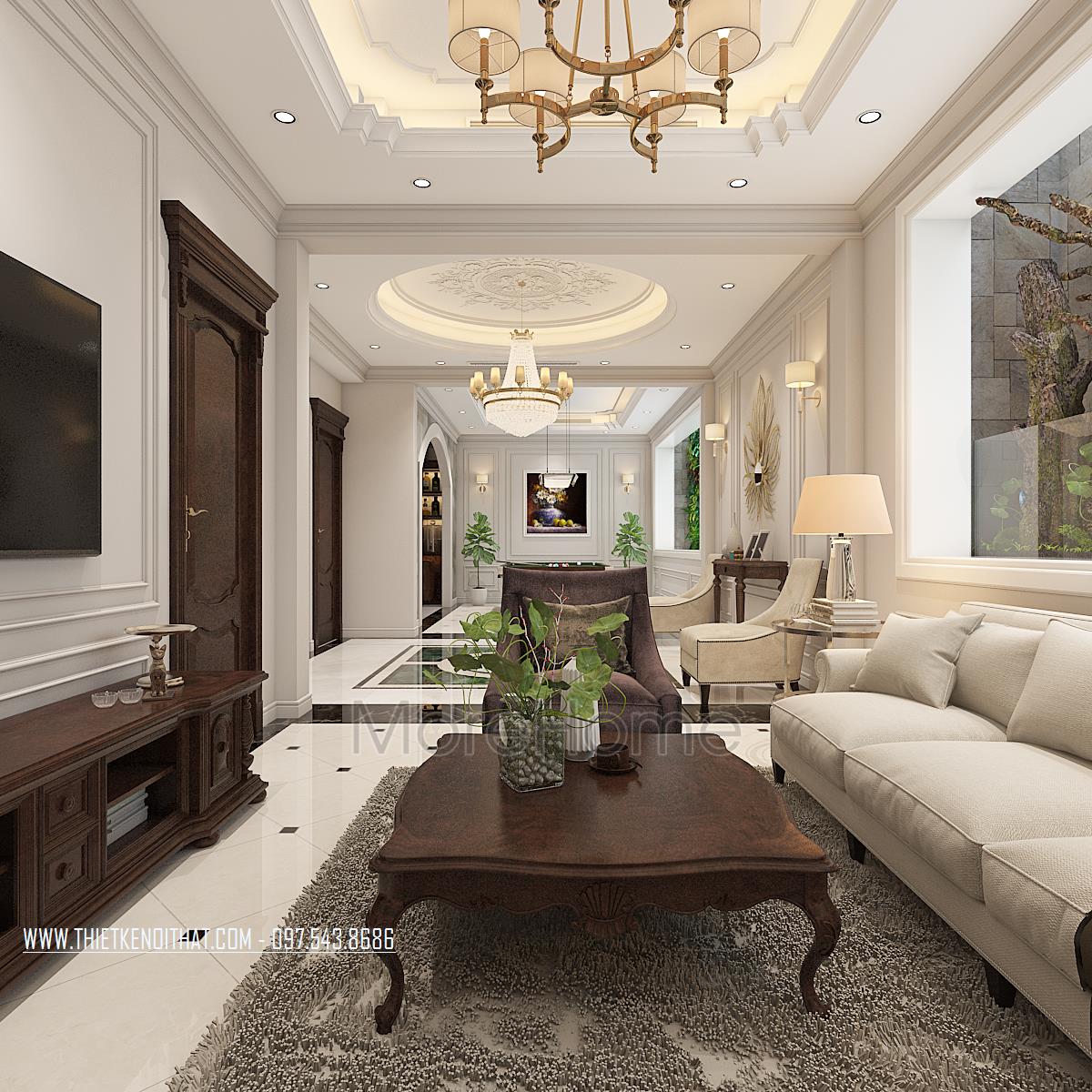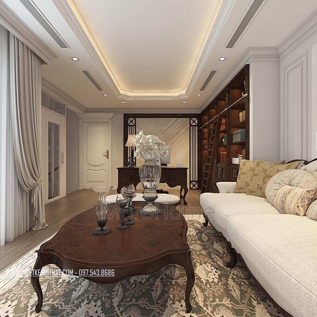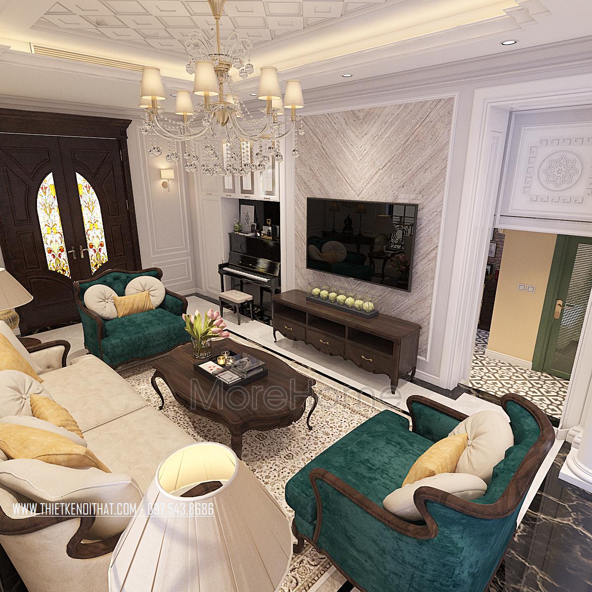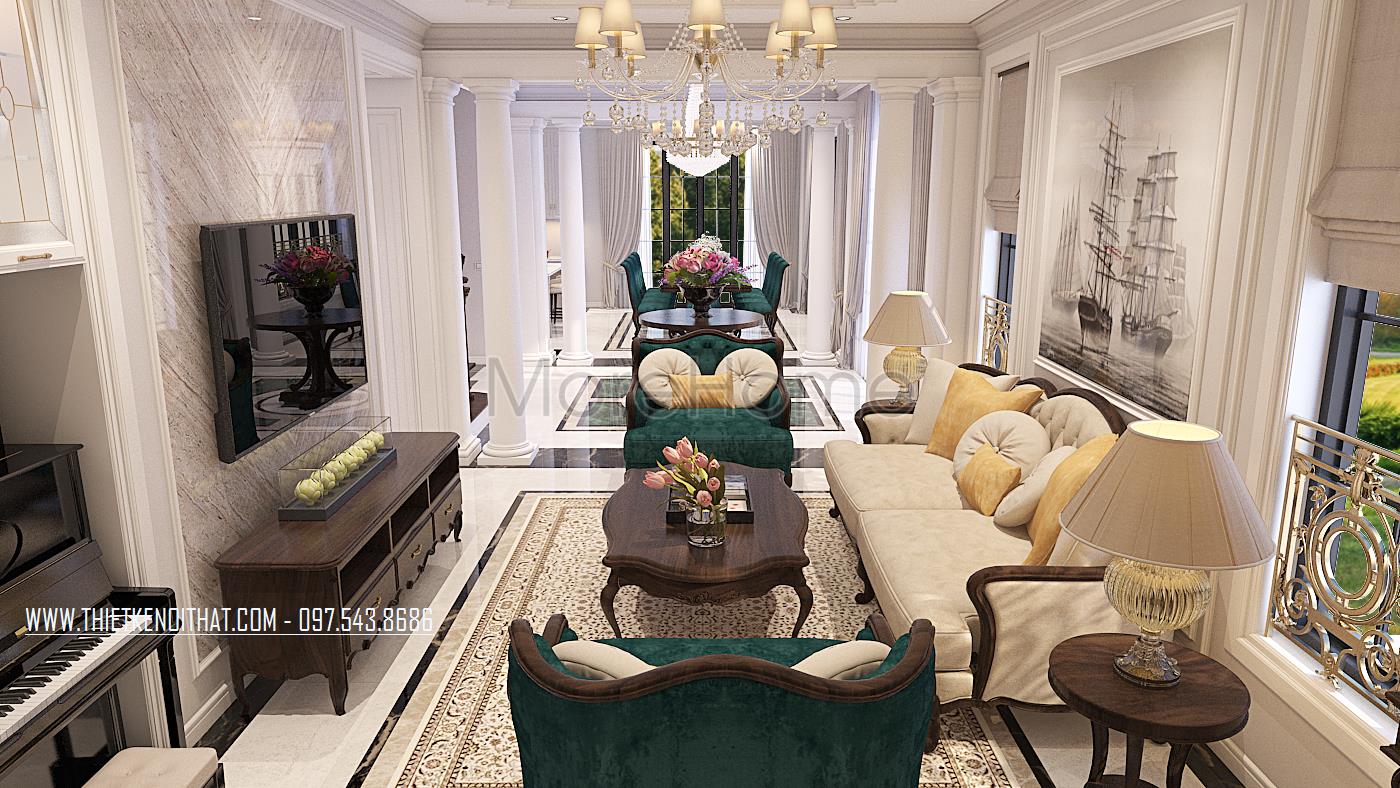 Thiết kế nội thất biệt thự phong cách tân cổ điển thuộc khu tổ hợp cao cấp Vinhomes Riverside là một trong những căn hộ nổi bật với đặc điểm kiến trúc riêng, khắc học được rõ sở thích và cá tính của gia chủ. Ngay từ thiết kế nội thất phòng khách kiến trúc sư đã gây ấn tượng bởi các đường nét và chi tiết tỉ mỉ, tinh tế. Thiết kế ghế sofa được kiến trúc sư lựa chọn có kích cỡ khá rộng rãi, tone màu xanh coba cổ điển kết hợp với sắc trắng tinh khổi cũng là điểm đặc biệt thu hút. Thay vì việc sử dụng các đường thẳng hay các khối hình rõ ràng như thiết kế nội thất phong cách hiện đại, chúng ta có thể dễ dàng nhận ra kiến trúc sư sử dụng rất nhiều đường cong hay chi tiết trạm khắc cầu kỳ ngay từ các chi tiết nhỏ như ghế sofa, đèn bàn, bàn nước, hay gối tựa,…