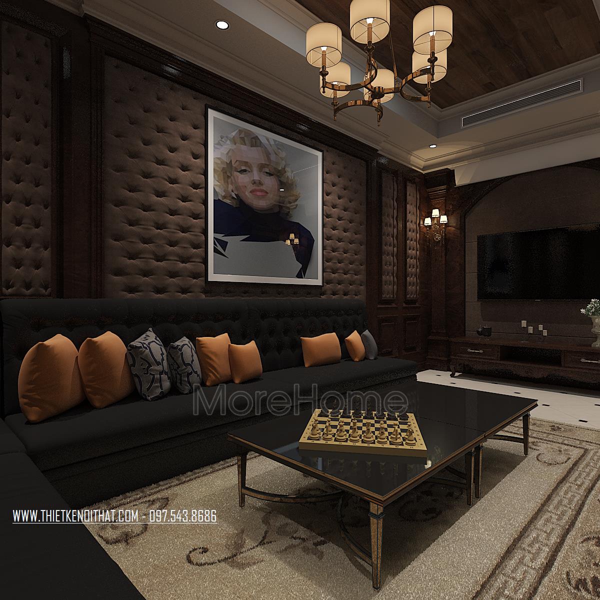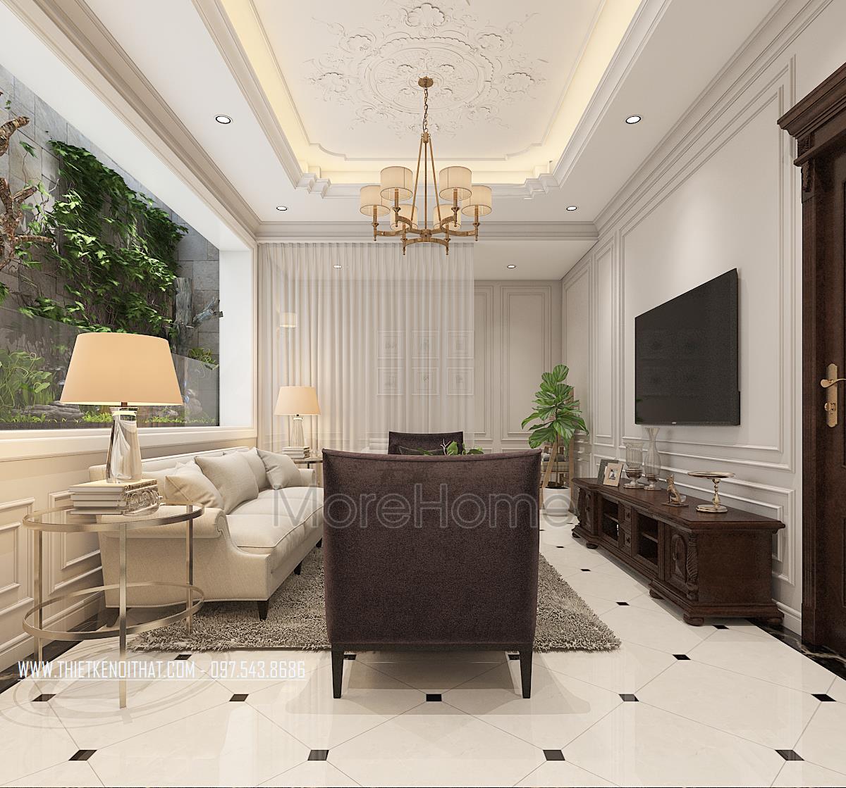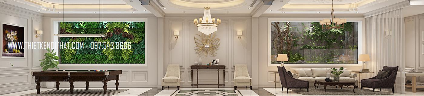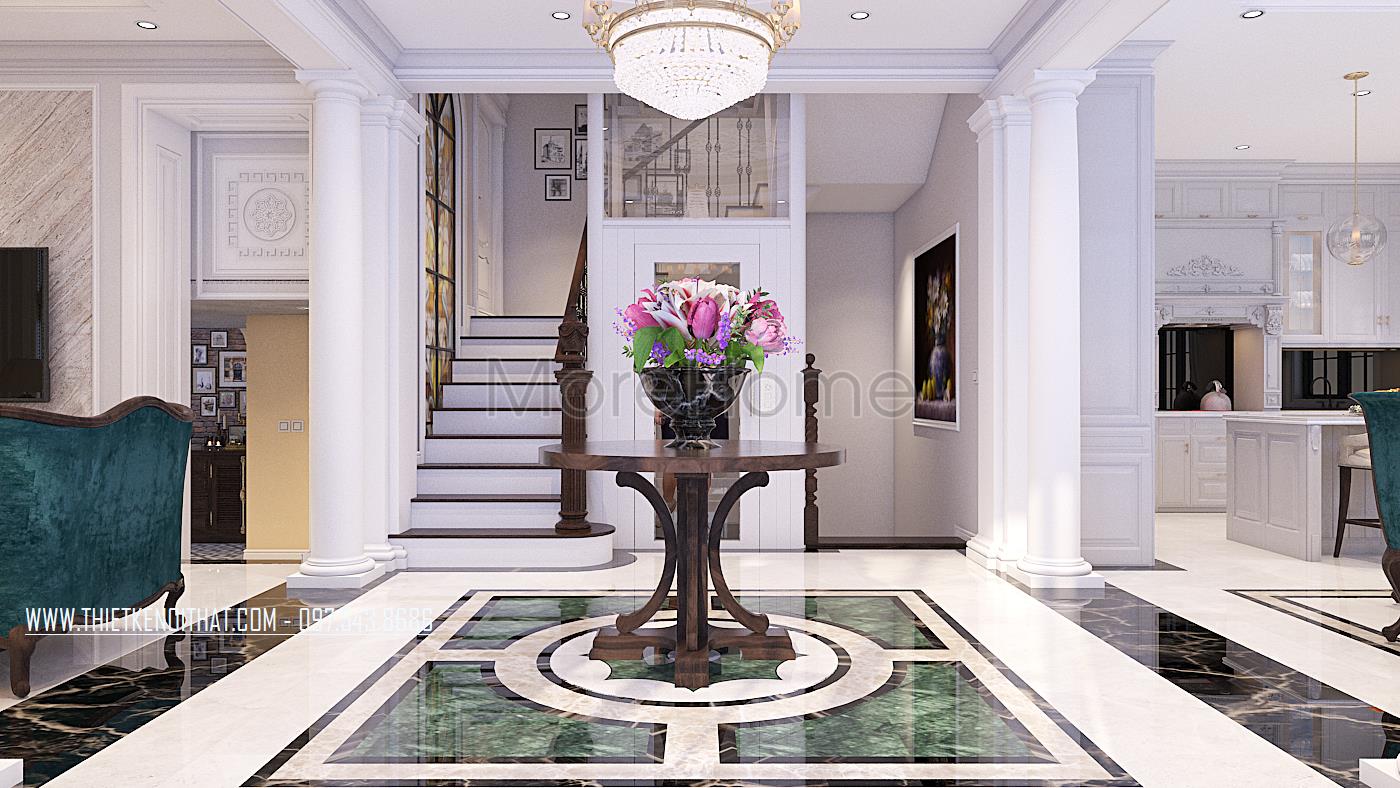 Thiết kế nội thất biệt thự phong cách tân cổ điển thuộc khu tổ hợp cao cấp Vinhomes Riverside là một trong những căn hộ nổi bật với đặc điểm kiến trúc riêng, khắc học được rõ sở thích và cá tính của gia chủ. Ngay từ thiết kế nội thất phòng khách kiến trúc sư đã gây ấn tượng bởi các đường nét và chi tiết tỉ mỉ, tinh tế. Thiết kế ghế sofa được kiến trúc sư lựa chọn có kích cỡ khá rộng rãi, tone màu xanh coba cổ điển kết hợp với sắc trắng tinh khổi cũng là điểm đặc biệt thu hút. Thay vì việc sử dụng các đường thẳng hay các khối hình rõ ràng như thiết kế nội thất phong cách hiện đại, chúng ta có thể dễ dàng nhận ra kiến trúc sư sử dụng rất nhiều đường cong hay chi tiết trạm khắc cầu kỳ ngay từ các chi tiết nhỏ như ghế sofa, đèn bàn, bàn nước, hay gối tựa,…