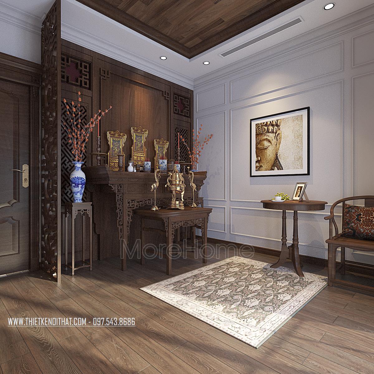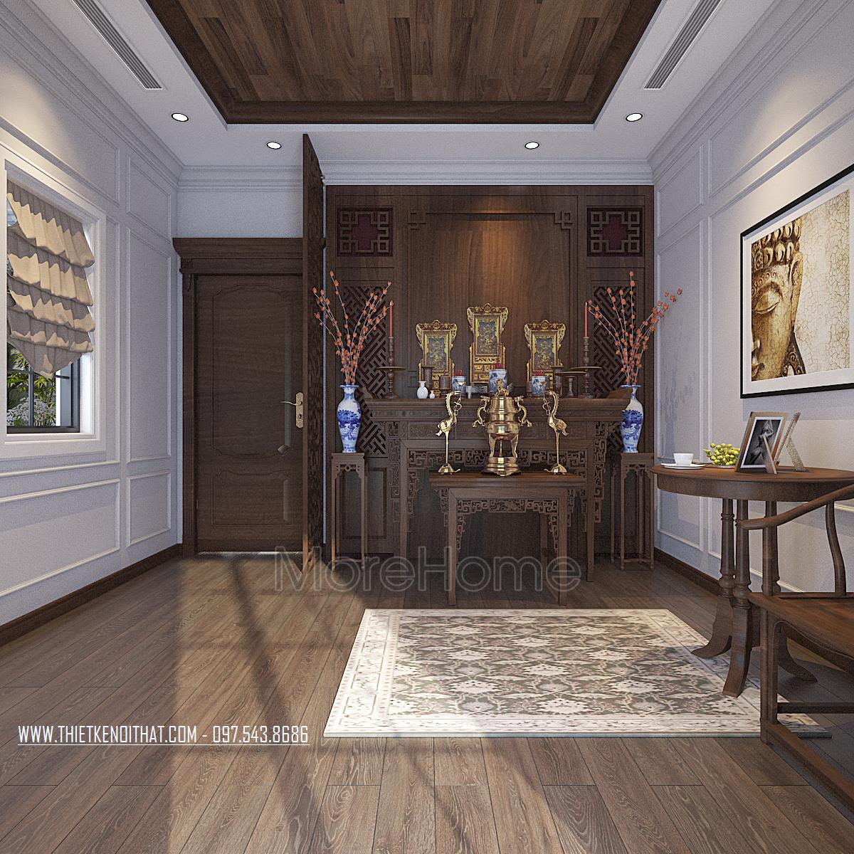 Một khu vực phòng riêng rộng rãi được sử dụng làm không gian linh thiêng thờ cúng. Thiết kế gỗ tự nhiên được ưu ái hơn cả giúp mang đến sự thoải mái và yên bình cho không gian thờ cúng. Bên cạnh đó, các yếu tố phong thủy tâm linh cũng được tuân theo mang lại sự bình tâm trong gia chủ. Các bức vách gỗ với hoa văn tinh xảo hay tranh treo tường góp phần lớn thể hiện tính thẩm mỹ cho không gian này.