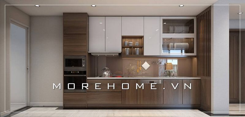 Mẫu tủ bếp gỗ công nghiệp hiện đại, màu nâu nhẹ nhàng đơn giản cho không gian phòng bếp chung cư