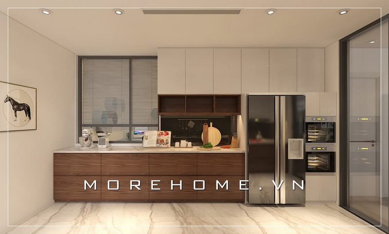 Mẫu tủ bếp gỗ công nghiệp sử dụng gam màu nâu - trắng hiện đại, thiết bị bếp đa năng giúp không gian phòng bếp tinh tế và tiện nghi hơn